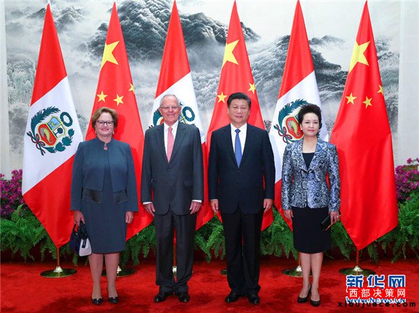 9月13日,國家主席習近平在北京人民大會堂同秘魯總統(tǒng)庫琴斯基舉行會談。會談前,習近平在人民大會堂東門外廣場為庫琴斯基舉行歡迎儀式。這是習近平和夫人彭麗媛同庫琴斯基總統(tǒng)夫婦合影。