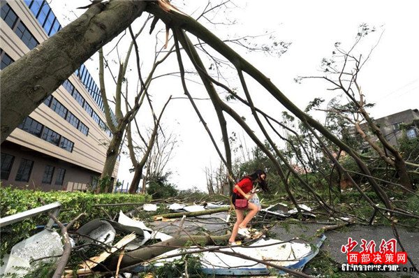 9月15日,今年第14號(hào)臺(tái)風(fēng)“莫蘭蒂”于凌晨3時(shí)05分在廈門翔安沿海登陸,登陸時(shí)中心附近最大風(fēng)力15級(jí)(48米/秒,強(qiáng)臺(tái)風(fēng)級(jí)),中心氣壓945百帕。圖為廈門市區(qū)路上大批車輛被吹倒的樹(shù)木損壞。