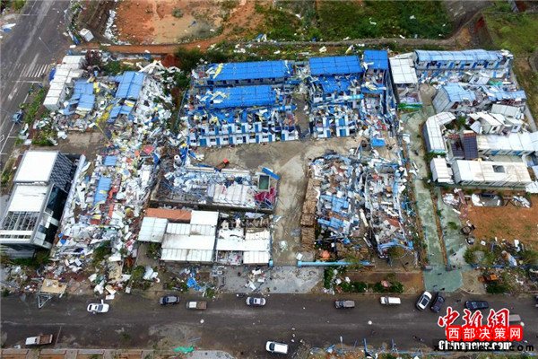 9月15日,今年第14號(hào)臺(tái)風(fēng)“莫蘭蒂”于凌晨3時(shí)05分在廈門翔安沿海登陸,登陸時(shí)中心附近最大風(fēng)力15級(jí)(48米/秒,強(qiáng)臺(tái)風(fēng)級(jí)),中心氣壓945百帕。圖為航拍登陸點(diǎn)翔安一工地工棚被完全摧毀。