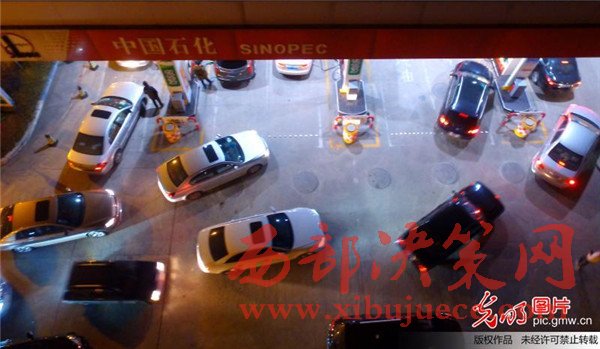 2017年1月12日晚,航拍揚(yáng)州一家加油站,車主排隊(duì)等待加油。