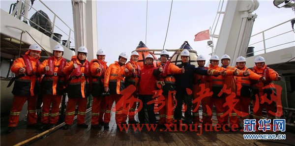 “海洋六號”科考人員完成多道地震調查后擺出慶賀手勢。“海洋六號”綜合調查船是由我國自主設計建造,集地震、地質調查等多項調查功能于一體的綜合地質地球物理調查船。它計劃2月初離開南極半島海域啟程返航,今年4月返抵廣州。