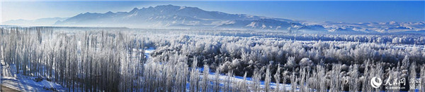綿延百里的新疆尼勒克縣喀什河谷次生林在冷空氣的作用下,霧氣蒸騰,21萬(wàn)畝林帶凝成了玉樹(shù)瓊花的霧凇景觀。迎著日出的霞光,從山上向下俯視,整個(gè)河谷云蒸霞蔚,宛如置身云端。翻滾的云海讓遠(yuǎn)山和近樹(shù)若影若現(xiàn),恍若仙境。待太陽(yáng)升高,再浮現(xiàn)河谷次生林帶,猶如一條晶瑩剔透的玉帶飄落在天山之下。