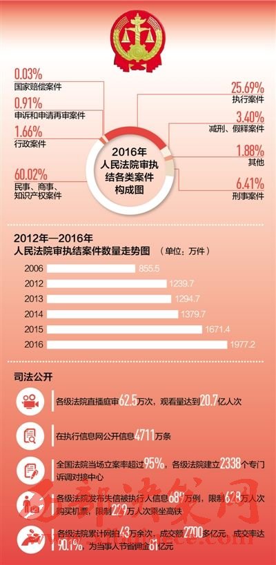 2016年,各級法院向執(zhí)行難全面宣戰(zhàn),共受理執(zhí)行案件614.9萬件,執(zhí)結(jié)507.9萬件,同比分別上升31.6%和33.1%,執(zhí)行到位金額1.5萬億元,同比上升54%。與公安部等10多個部門建立網(wǎng)絡(luò)執(zhí)行查控系統(tǒng),執(zhí)行法官足不出戶即可依法查詢被執(zhí)行人財產(chǎn)和相關(guān)信息,實現(xiàn)了執(zhí)行模式的根本變革。發(fā)布失信被執(zhí)行人信息689萬例,限制628萬人次購買機(jī)票,限制229萬人次乘坐高鐵。依法懲治拒不執(zhí)行裁判行為,司法拘留1.6萬人,追究刑事責(zé)任2167人,讓司法裁判真正成為懲治違法失信的利劍。