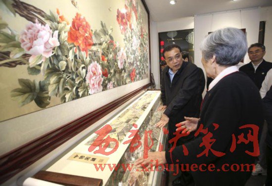 李克強(qiáng)2017年5月8日晚來(lái)到開封七盛角民俗文化街,在王素花汴繡館長(zhǎng)時(shí)間駐足。82歲的王素花多年繼承創(chuàng)新宋代傳統(tǒng)刺繡工藝,是汴繡領(lǐng)軍人物。總理仔細(xì)觀賞后稱贊她用色“多而不雜”,技藝“爐火純青”。