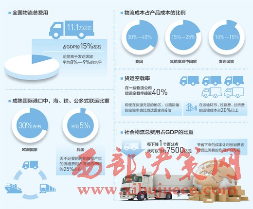 單線成本不高,但綜合成本高,主因在于不必要的搬倒騰挪而產(chǎn)生的流通費(fèi)用。一些物流公司的貨車空載率近40%,比發(fā)達(dá)國家高4倍甚至更多,一邊是“車等貨”,一邊是“貨等車”