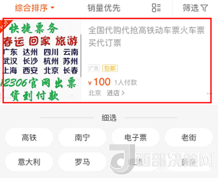 1月30日下午,人民網(wǎng)IT頻道在某著名電商平臺(tái)搜索“火車票代購”,在首屏也能搜到疑似黃牛的賣家,其廣告圖片里就有“春節(jié)回家、12306官網(wǎng)出票”等字樣,標(biāo)價(jià)為100元,與這篇報(bào)道的黃牛加價(jià)情況基本一致。