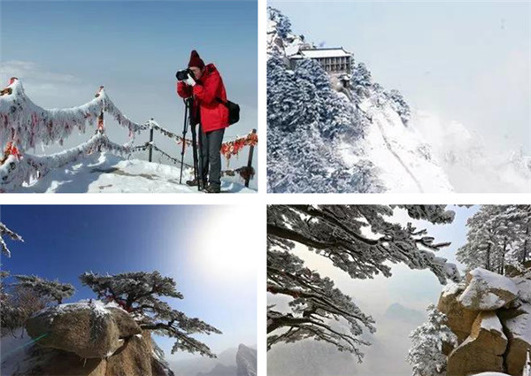 華山在11月進(jìn)入冬季,12月至次年3月全山飄雪,而2月前為最旺雪期。游客可欣賞到難得一見的華山雪景——美麗的霧凇給樹木、巖石、屋舍都披上一層晶瑩的薄衣,尤其在大雪覆蓋后,山景變成一幅曼妙的白色圖畫,峰上的樹木和古藤被透明的冰層包裹,極富魅力。