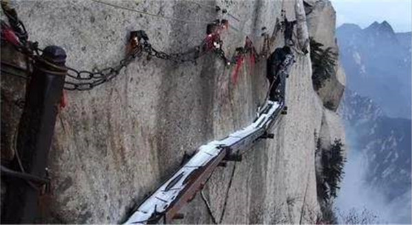長空棧道,可謂華山險道之首,它猶如一道奇異的仙練鑲嵌在南峰絕壁。明代“后七子”之一的李攀龍《太華山記》載:“出南天門向西就是棧道,棧雖有銅柱鐵索攔護(hù),然闊不盈尺。行二十余丈方至盡頭。下折為井,高約三丈,旁出復(fù)為棧……”置身其中,只覺背空腳虛,發(fā)豎氣閉,寒風(fēng)沖襠,骨松筋緊,膽大者有凌空欲飛之感,膽弱者心生抵近鬼門之憂。多少年來“長空棧道”以它特有的絕險情懷召喚著天下英雄豪杰一試身手,體驗驚心動魄,揮灑豪邁人生。