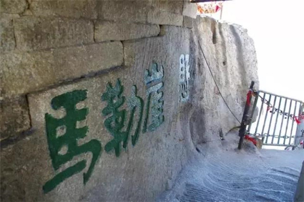 華山長空棧道上下皆是懸崖絕壁,鐵索橫懸,由條石搭成尺許路面,下由石柱固定。由于棧道險(xiǎn)峻,故當(dāng)?shù)厝擞?ldquo;小心九厘三分,要尋尸首,洛南商州”之說。這里只是探險(xiǎn)之道,并非登山必由之路,膽小人就在升表臺看看也就行了。所以在長空棧道的入口處,就有這樣一塊石刻,上邊刻著“懸崖勒馬”四個(gè)大字。懸崖勒馬的字面意思就是說在高高的山崖邊上勒住馬。比喻到了危險(xiǎn)的邊緣及時(shí)清醒回頭。面對長空棧道這樣險(xiǎn)峻的地勢,游人確實(shí)要比正常情況下更加清醒。