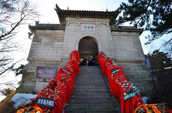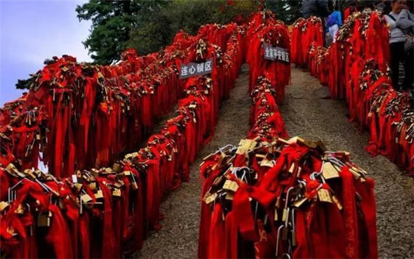 金鎖關(guān)北接五云峰,南控華山主峰,東西兩側(cè)壑深千丈,關(guān)前僅有一米寬的臺(tái)階石徑。環(huán)周古松蒼翠,奇石林立,常有祥云環(huán)繞,風(fēng)光非常迤麗。關(guān)內(nèi)關(guān)外登山路兩側(cè)鐵索上情侶鎖、平安鎖,重重疊疊,紅繩彩線迎風(fēng)搖曳,不失為關(guān)前一道美麗的風(fēng)景線。在這里,鎖住你對(duì)愛(ài)情的誓言,表達(dá)你堅(jiān)如磐石的愛(ài)情忠貞!