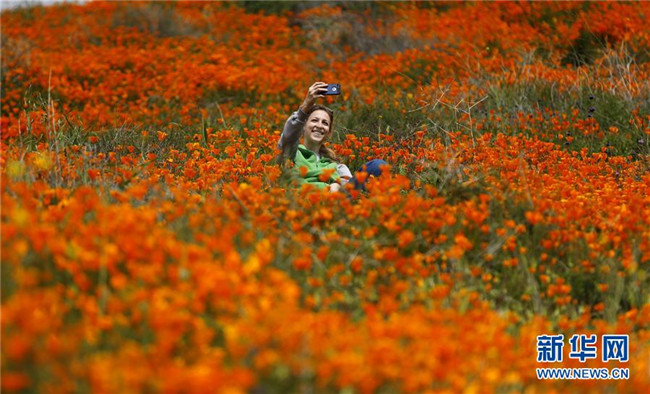 3月10日,在美國(guó)加利福尼亞州埃爾西諾湖地區(qū),一名游客在花叢中拍照。