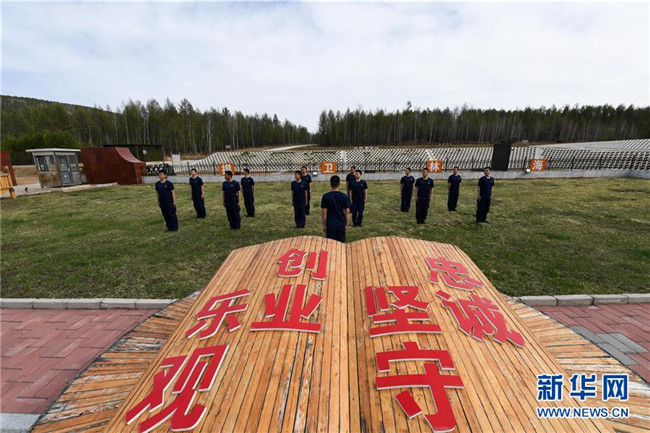 這是內(nèi)蒙古森林消防總隊(duì)大興安嶺支隊(duì)奇乾中隊(duì)的營(yíng)地,營(yíng)地后山上的“忠誠(chéng)”二字是用白樺樹樹干拼接而成(5月15日攝)。新華社記者 劉磊 攝