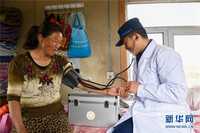 奇乾中隊(duì)隊(duì)醫(yī)為營(yíng)地附近僅有的幾戶村民測(cè)量血壓(5月19日攝)。新華社記者 劉磊 攝