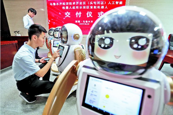 6月10日,在烏魯木齊經(jīng)濟技術(shù)開發(fā)區(qū)(頭屯河區(qū))維泰大廈,新疆創(chuàng)澤機器人科技有限公司工程師在調(diào)試機器人“創(chuàng)創(chuàng)”。 當日,該公司生產(chǎn)的75臺人工智能機器人正式交付經(jīng)開區(qū)(頭屯河區(qū))政務(wù)服務(wù)、社區(qū)、學校等場所,這也標志著烏魯木齊經(jīng)開區(qū)(頭屯河區(qū))國家級人工智能機器人應(yīng)用示范區(qū)正式啟動。(謝龍)