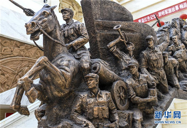這是在新疆生產(chǎn)建設(shè)兵團(tuán)第六師五家渠市博物館內(nèi)展出的大型雕塑《軍墾魂》(7月31日攝)。新華社記者 王菲 攝