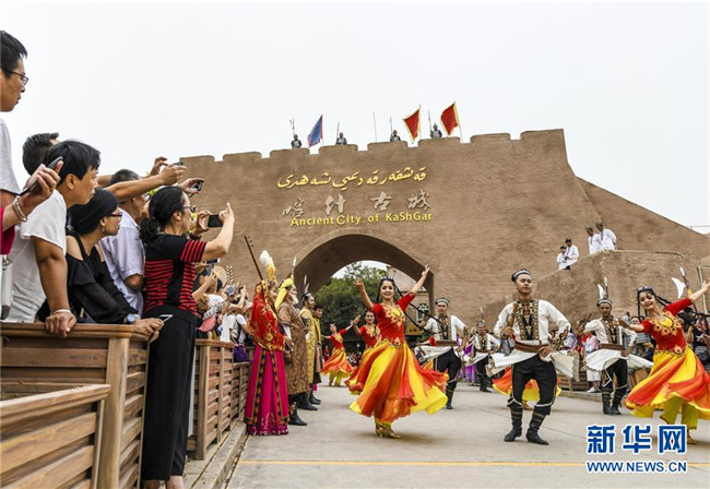游客在新疆喀什古城景區(qū)開城儀式上觀看歌舞表演(8月13日攝)。 新華社記者 王菲 攝
