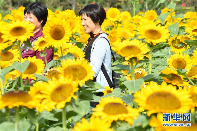 10月10日,游客在湖南省森林植物園的向日葵花海中漫步賞花。新華社記者 陳澤國 攝