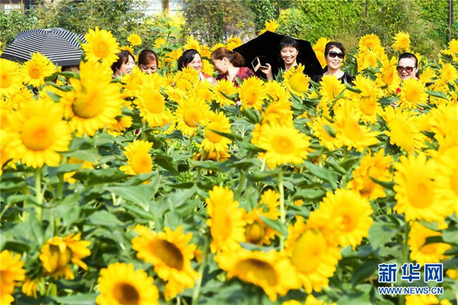 10月10日,游客在湖南省森林植物園觀賞向日葵。新華社記者 陳澤國 攝