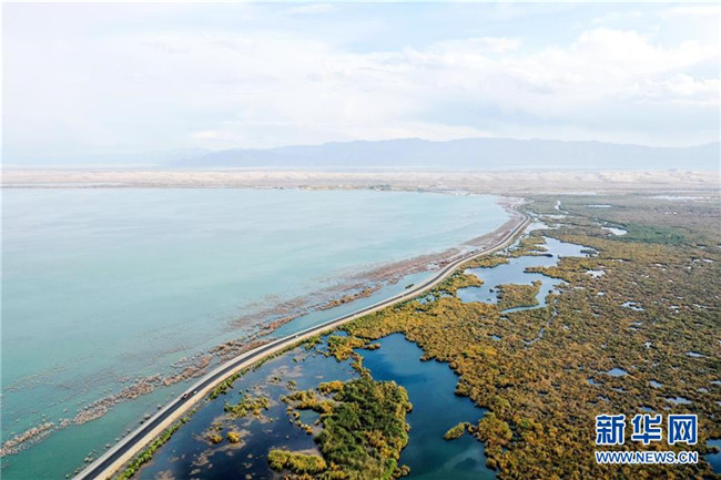 這是新疆博斯騰湖河堤公路(10月12日無人機(jī)拍攝)。入秋以來,新疆博斯騰湖碧波蕩漾,美景如畫,吸引各地游客前來游玩。新華社記者丁磊攝