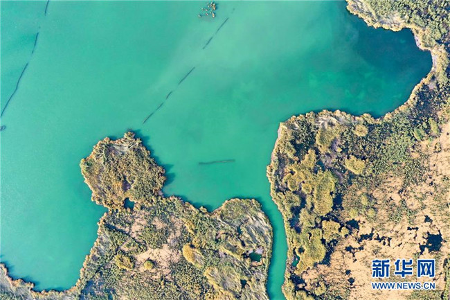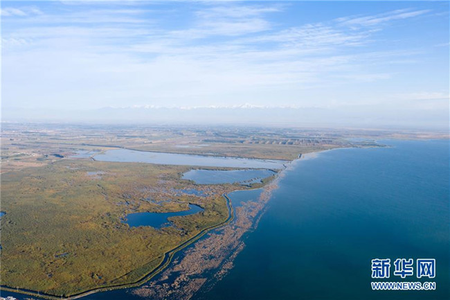 這是新疆博斯騰湖濕地一景(10月12日無人機(jī)拍攝)。入秋以來,新疆博斯騰湖碧波蕩漾,美景如畫,吸引各地游客前來游玩。新華社記者丁磊攝