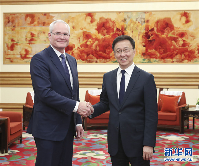 12月3日,中共中央政治局常委、國(guó)務(wù)院副總理韓正在北京中南海會(huì)見美國(guó)??松梨诠径麻L(zhǎng)兼首席執(zhí)行官伍德倫。 新華社記者 丁海濤 攝