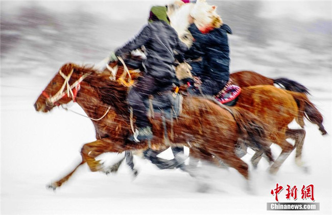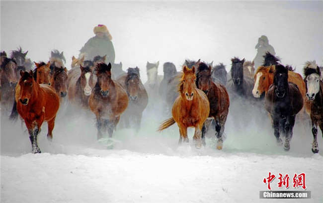 冬至過后,新疆昭蘇縣大草原上白雪皚皚、銀裝素裹,牧民趕著駿馬在雪海里表演萬馬奔騰和刁羊比賽。