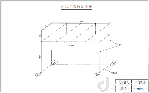 圖紙畫(huà)好后,王建業(yè)火速發(fā)給了材料員老王,老王憑借多年的人脈,在車(chē)間找來(lái)電焊師傅,又拾了廢棄的幾塊角鋼和幾個(gè)車(chē)輪,半晌就把王建業(yè)想要的東西給做了出來(lái)。其實(shí)很簡(jiǎn)單,根據(jù)壓風(fēng)自救箱的尺寸,利用扁鐵構(gòu)建整體框架,下方安裝四個(gè)滑輪即可投入使用。