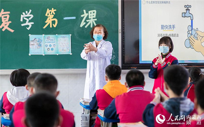 內(nèi)蒙古呼和浩特市第十二中學校醫(yī)為學生講解疫情防護知識和衛(wèi)生常識,上好開學第一課。