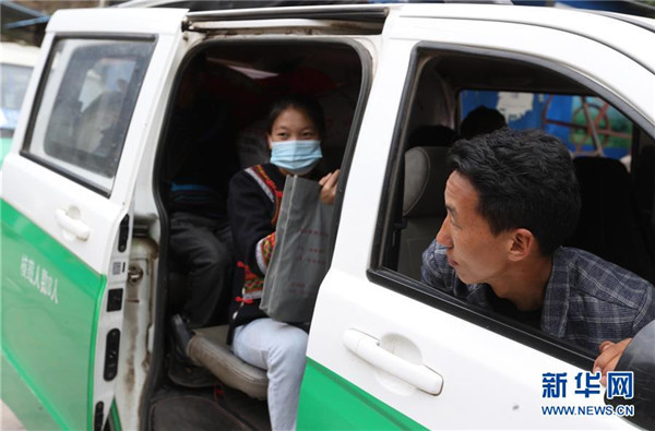 5月12日,在四川省昭覺縣阿土列爾村,莫色雄體(右)坐上車準備前往昭覺縣易地扶貧搬遷縣城集中安置點的新家。新華社記者江宏景攝