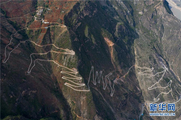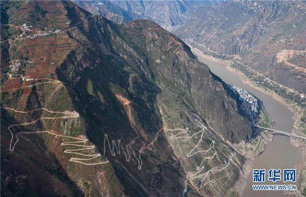 金陽縣蘆稿鎮(zhèn)大灣子村12公里左右的通村公路,28個彎蜿蜒盤旋在金沙江峽谷懸崖絕壁邊(6月7日攝,無人機(jī)照片)。坐落在金沙江畔的四川省金陽縣是國家級深度貧困縣,境內(nèi)群山連綿起伏,海拔落差大,眾多村寨處于高山或者高半山上,道路施工難度大。近年來,當(dāng)?shù)卣畬⒔煌ㄗ鳛槊撠毠缘南葘?dǎo)性工程,路越修越寬、越修越好,成為當(dāng)?shù)厝罕姷拿撠氈赂宦?。截?019年底,金陽縣實現(xiàn)所有鄉(xiāng)鎮(zhèn)通油路、建制村通硬化路,鄉(xiāng)道里程達(dá)329.9公里,村道里程達(dá)866.8公里。新華社記者江宏景攝