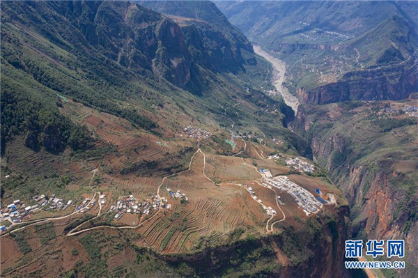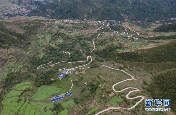 金陽縣天地壩鎮(zhèn)通往吉史里口村易地扶貧搬遷集中安置點(diǎn)的道路(6月7日攝,無人機(jī)照片)。坐落在金沙江畔的四川省金陽縣是國家級深度貧困縣,境內(nèi)群山連綿起伏,海拔落差大,眾多村寨處于高山或者高半山上,道路施工難度大。近年來,當(dāng)?shù)卣畬⒔煌ㄗ鳛槊撠毠缘南葘?dǎo)性工程,路越修越寬、越修越好,成為當(dāng)?shù)厝罕姷拿撠氈赂宦?。截?019年底,金陽縣實現(xiàn)所有鄉(xiāng)鎮(zhèn)通油路、建制村通硬化路,鄉(xiāng)道里程達(dá)329.9公里,村道里程達(dá)866.8公里。新華社記者江宏景攝