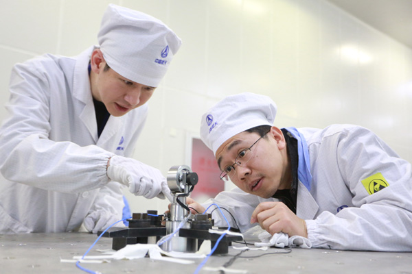 △中國航天科技集團(tuán)公司的青年科研人員在做產(chǎn)品試驗(yàn)。