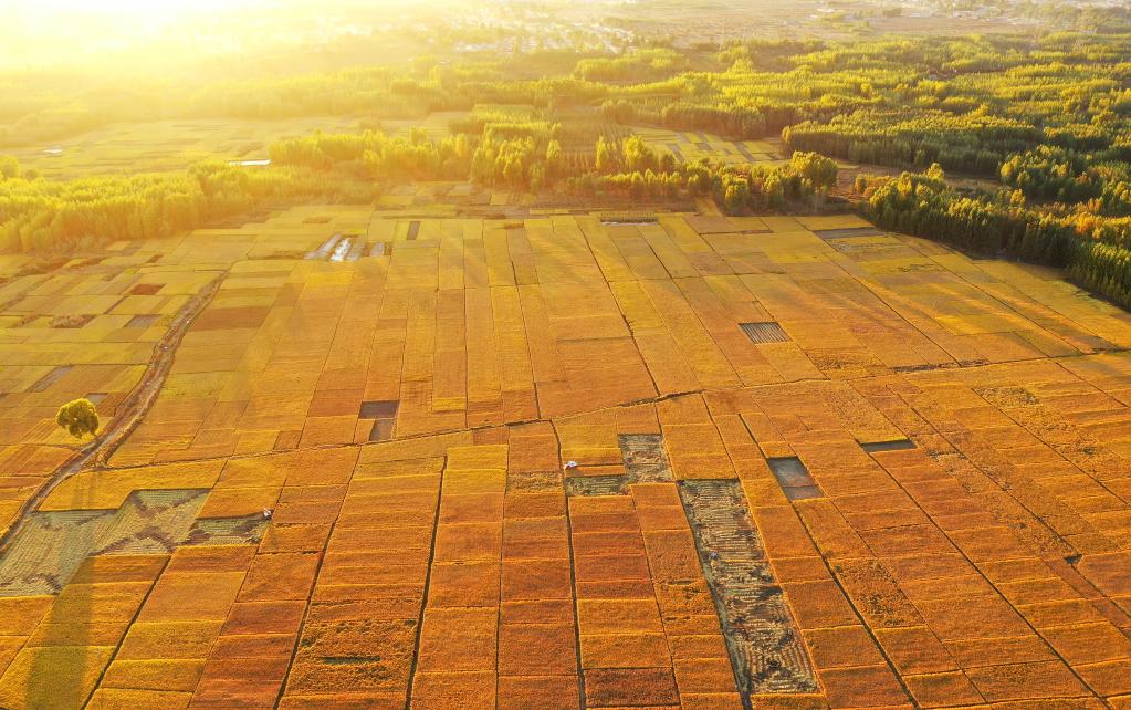 2020年10月18日在河北省灤州市古城街道蔣莊村拍攝的稻田(無(wú)人機(jī)照片)。新華社記者 牟宇 攝