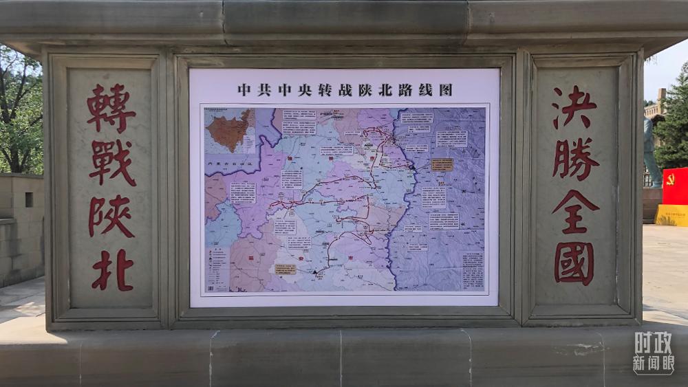 △楊家溝革命舊址內(nèi)展出的“中共中央轉(zhuǎn)戰(zhàn)陜北路線圖”。(總臺(tái)央視記者許永松拍攝)