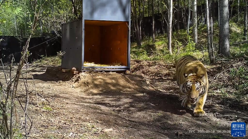 2021年5月18日,在黑龍江省穆棱林業(yè)局有限公司林場(chǎng),之前在密山市獲得成功救護(hù)的野生東北虎從鐵箱子里走出,回歸自然(視頻截圖)。新華社發(fā)