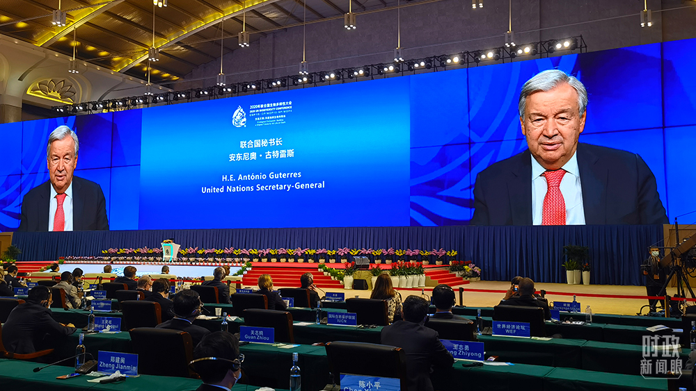 △聯(lián)合國秘書長古特雷斯通過視頻方式致辭。(總臺央視記者舒貝拍攝)