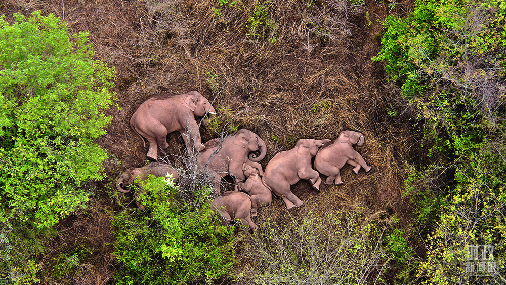 △2021年6月7日,云南省森林消防總隊(duì)的無人機(jī)監(jiān)測人員觀測到野象群暫停遷徙的一幕。這是監(jiān)測野象12天來,第一次發(fā)現(xiàn)象群集體躺著睡覺。(圖/視覺中國)