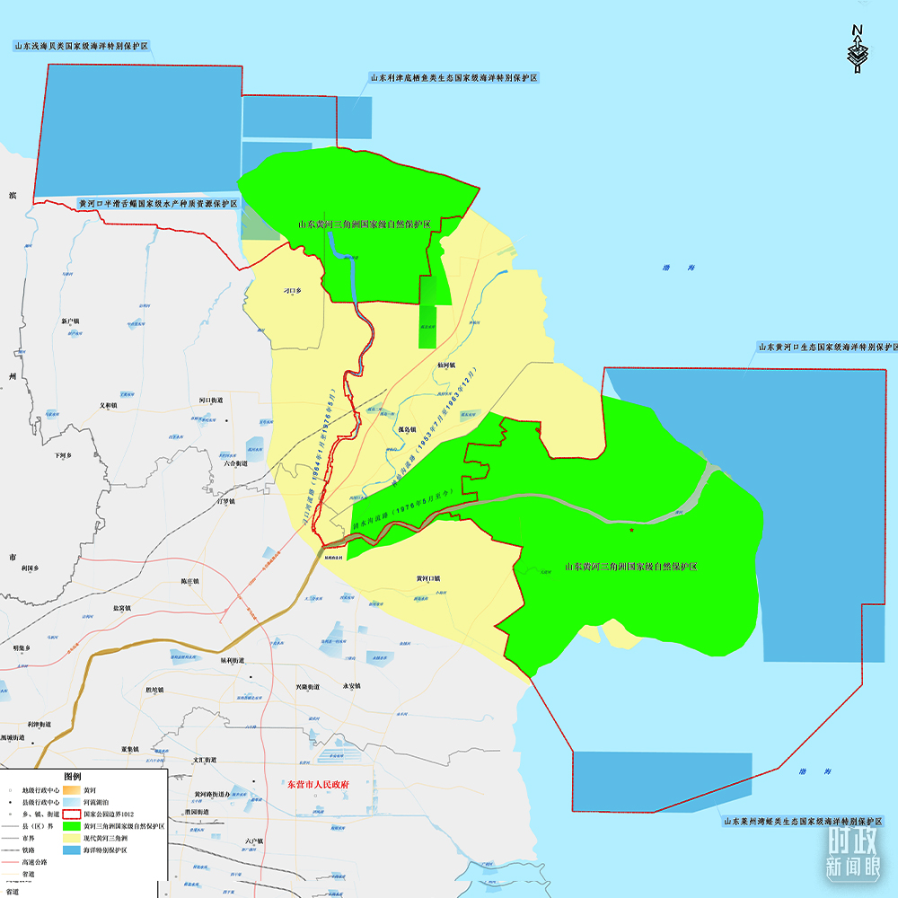 △圖中,淡黃色區(qū)域為現(xiàn)代黃河三角洲,面積約2400平方公里;綠色區(qū)域為黃河三角洲國家級自然保護區(qū),面積1530平方公里。(總臺央視記者盧心雨提供)