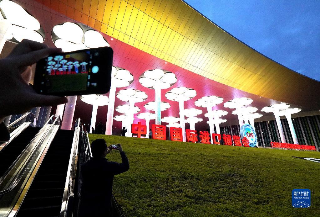 2018年11月4日,人們在拍攝國家會展中心(上海)場館夜景。2018年11月5日,首屆中國國際進口博覽會在上海開幕。新華社記者 陳飛 攝