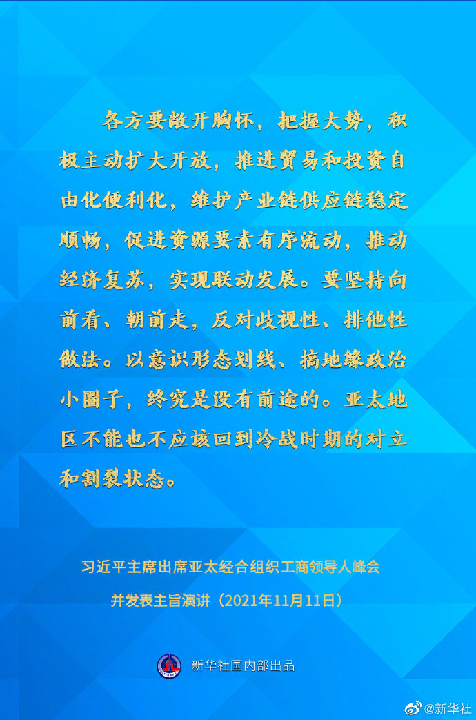 11月11日,國家主席習(xí)近平應(yīng)邀在北京以視頻方式向亞太經(jīng)合組織工商領(lǐng)導(dǎo)人峰會發(fā)表主旨演講。一起來看要點(diǎn)↓