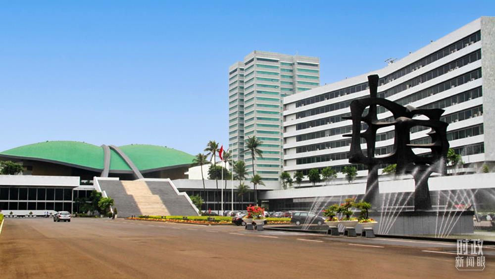△印度尼西亞國會(huì)外景。2013年10月,習(xí)主席在這里發(fā)表演講首次提出建設(shè)21世紀(jì)“海上絲綢之路”。(總臺(tái)國廣記者蔡靖骉拍攝)