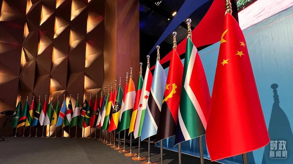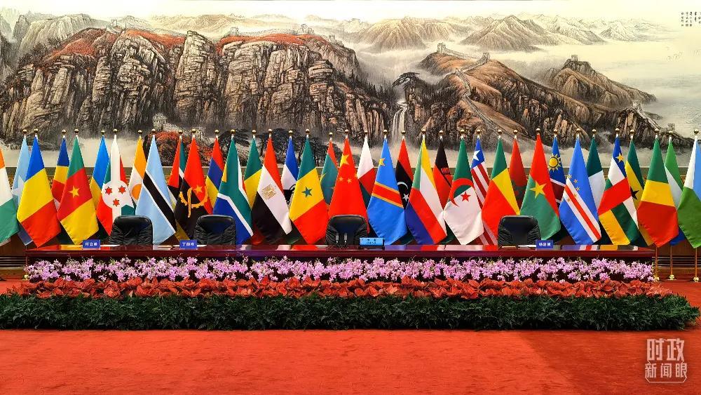 △東大廳內(nèi),中國(guó)和53個(gè)非洲國(guó)家國(guó)旗以及非洲聯(lián)盟旗幟組成的旗陣。(總臺(tái)央視記者范一鳴拍攝)