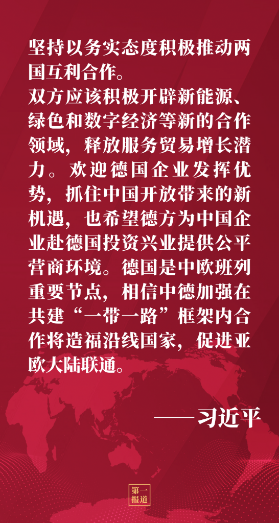 事實(shí)證明,只要中德雙方堅(jiān)持鞏固和深化互信,本著平等相待、聚焦合作、互利共贏的相處之道,就能推動(dòng)雙邊關(guān)系不斷取得新發(fā)展,辦成許多造福兩國和兩國人民以及世界的大事,共同為推動(dòng)人類和平與發(fā)展事業(yè)作出新貢獻(xiàn)。