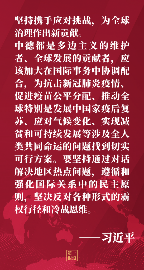 第三,堅(jiān)持?jǐn)y手應(yīng)對挑戰(zhàn),為全球治理作出新貢獻(xiàn)。中德都是多邊主義的維護(hù)者、全球發(fā)展的貢獻(xiàn)者,應(yīng)該加大在國際事務(wù)中協(xié)調(diào)配合,為抗擊新冠肺炎疫情、促進(jìn)疫苗公平分配、推動(dòng)全球特別是發(fā)展中國家疫后復(fù)蘇、應(yīng)對氣候變化、實(shí)現(xiàn)減貧和可持續(xù)發(fā)展等涉及全人類共同命運(yùn)的問題找到切實(shí)可行方案。要堅(jiān)持通過對話解決地區(qū)熱點(diǎn)問題,遵循和強(qiáng)化國際關(guān)系中的民主原則,堅(jiān)決反對各種形式的霸權(quán)行徑和冷戰(zhàn)思維。各國一起發(fā)展才是真發(fā)展。中方愿同德方攜手推動(dòng)落實(shí)聯(lián)合國2030年可持續(xù)發(fā)展議程。