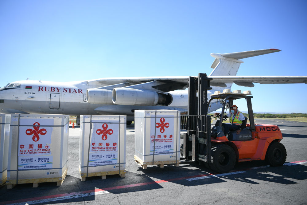 ↑2021年12月24日,在尼加拉瓜馬那瓜國(guó)際機(jī)場(chǎng),工作人員轉(zhuǎn)運(yùn)由中國(guó)國(guó)藥集團(tuán)生產(chǎn)的新冠疫苗。當(dāng)日,中國(guó)政府提供的第二批新冠疫苗運(yùn)抵馬那瓜,助力當(dāng)?shù)亻_(kāi)展疫苗接種計(jì)劃。