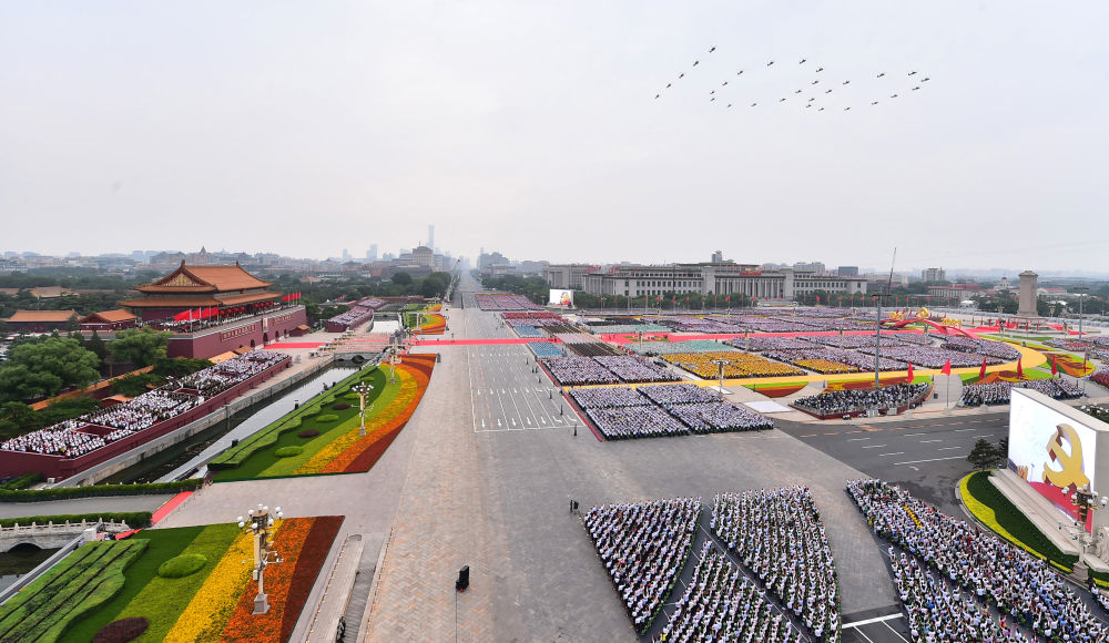 ↑2021年7月1日上午,慶祝中國(guó)共產(chǎn)黨成立100周年大會(huì)在北京天安門(mén)廣場(chǎng)隆重舉行。這是飛行慶祝表演。