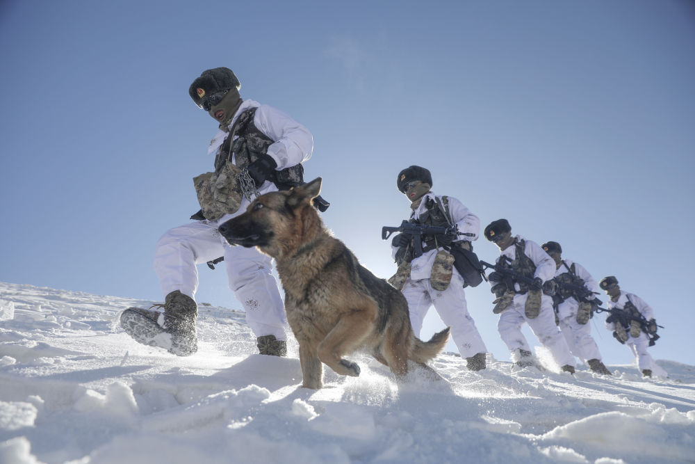 ↑2021年2月11日,駐守帕米爾高原的新疆喀什軍分區(qū)某邊防團(tuán)托克滿(mǎn)蘇邊防連官兵按計(jì)劃對(duì)海拔5100米的山口實(shí)施例行巡邏。