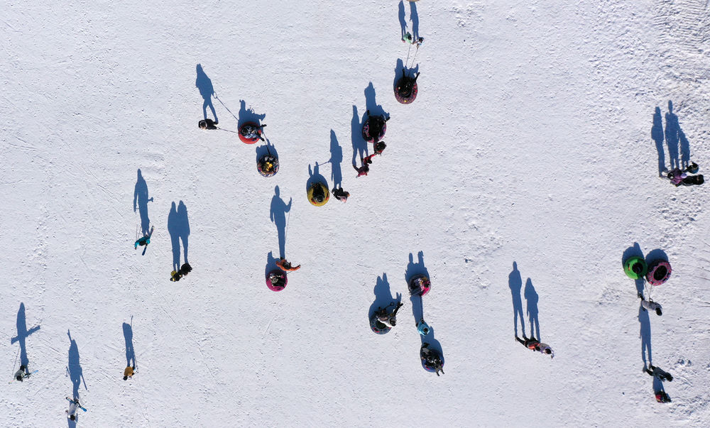 ↑2021年12月5日,游客在寧夏銀川市鳴翠湖滑雪場(chǎng)體驗(yàn)雪上運(yùn)動(dòng)(無(wú)人機(jī)照片)。