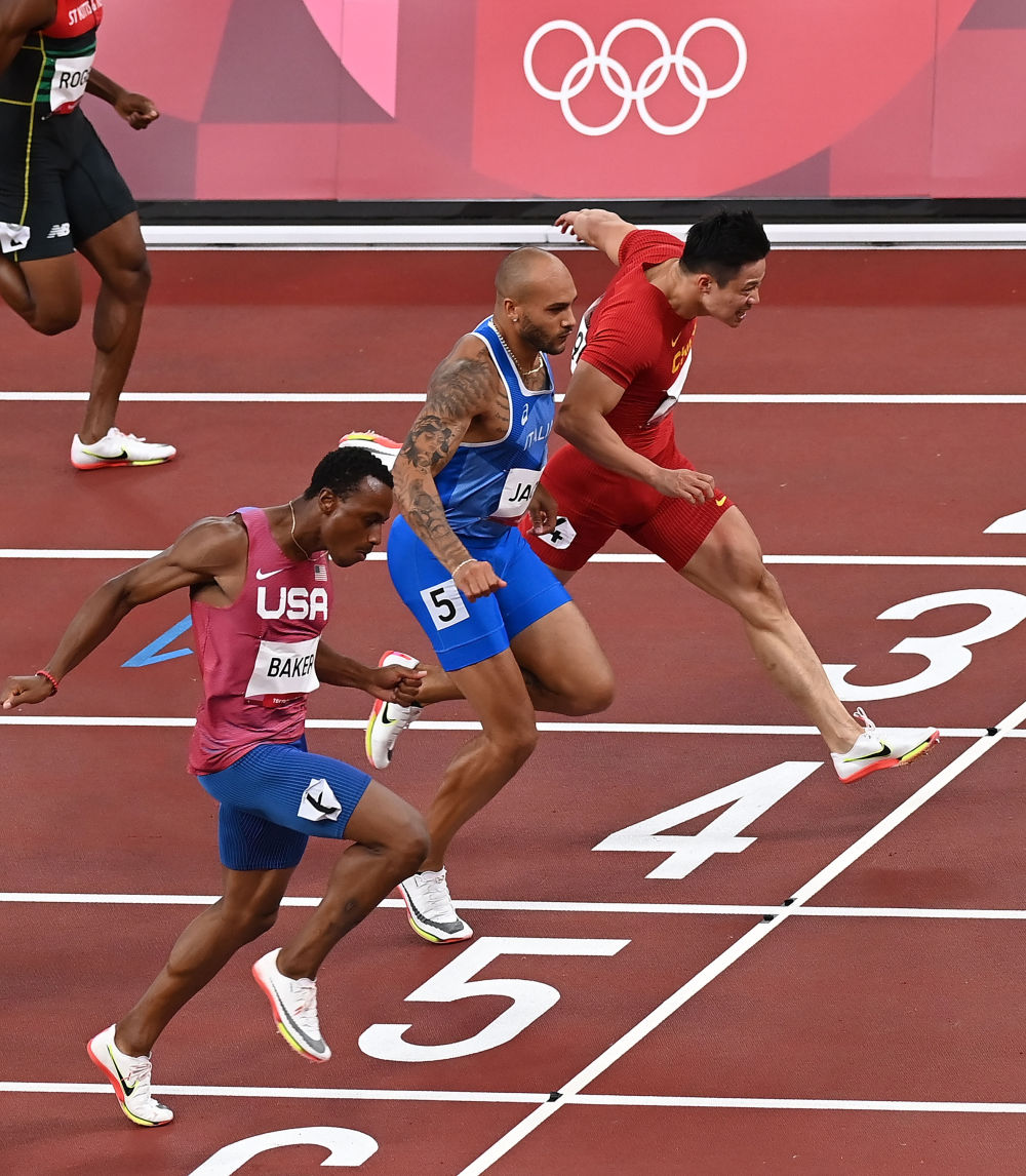 ↑2021年8月1日,東京奧運(yùn)會(huì)田徑男子100米半決賽在東京新國(guó)立競(jìng)技場(chǎng)舉行。中國(guó)選手蘇炳添(右一)跑出9秒83,以半決賽第一晉級(jí)決賽,同時(shí)創(chuàng)造了新的亞洲紀(jì)錄。