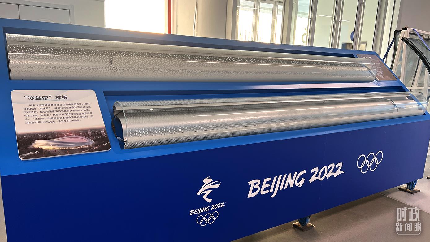 △“冰絲帶”由晶瑩剔透的超白玻璃彩釉印刷,平均每條絲帶長約620米。這是“冰絲帶”樣板。(總臺央視記者王鵬飛拍攝)